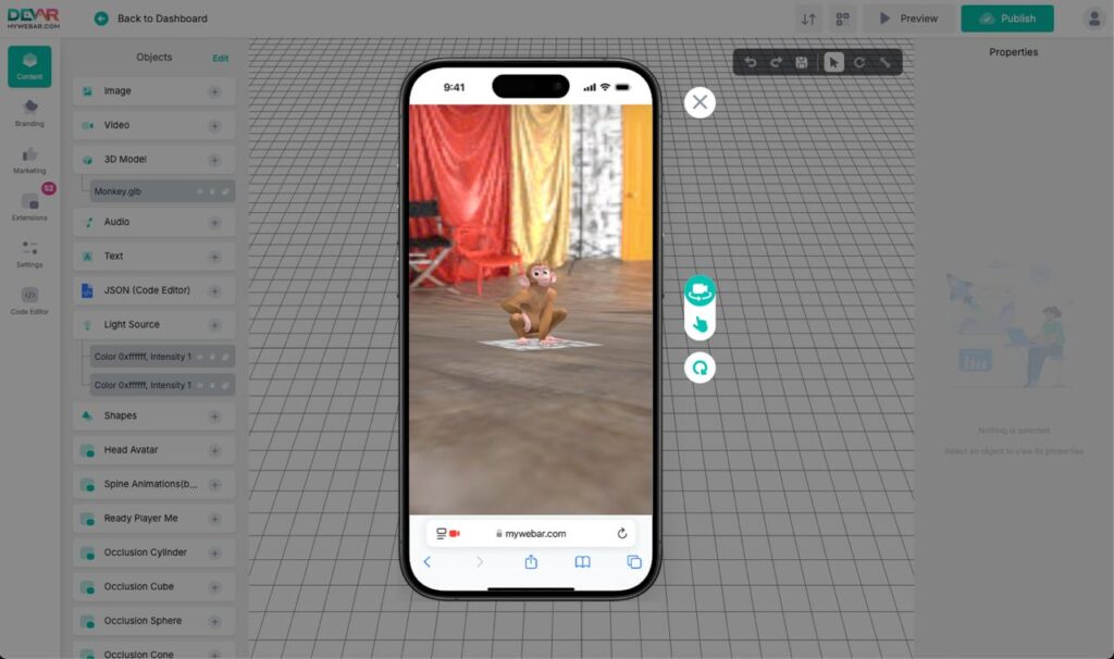 Testing should feel like using the thing. The updated preview gives you two ways to look at your scene before you scan a QR code. In real-world view, you get a sense of scale and placement, almost like peeking through a phone. In touch interaction mode, you orbit, pan, and zoom with your fingers to check hotspots, labels, and tap targets.